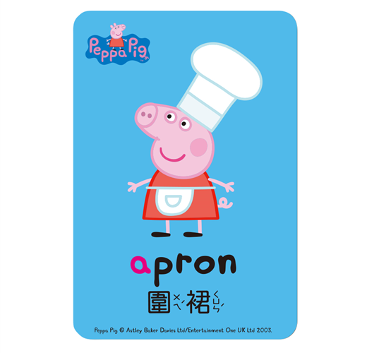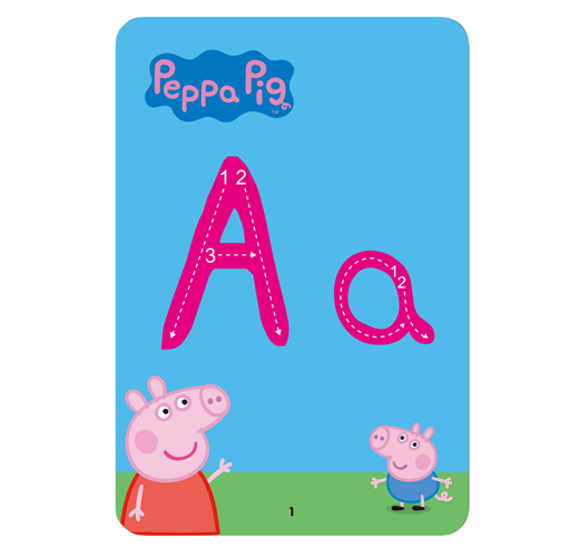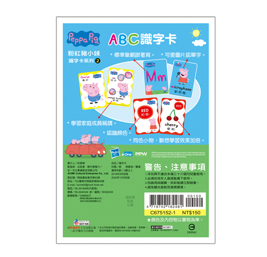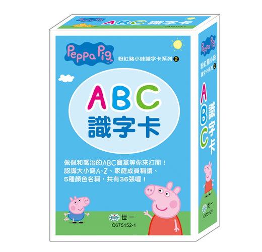 粉紅豬小妹佩佩是一隻很可愛但是有點愛指揮別人的4歲小豬,他和爸爸豬、媽 媽豬還有弟弟喬治每天都開心的生活在一起。 熱愛冒險的粉紅豬小妹這次帶領小朋友進入有趣的ABC世界!36張識字卡,A-Z字母卡(26張+1張大小寫字母表)、角色卡(4張)及顏色卡(5張)。字母卡正面是清晰、大字體的英文字母大小寫及筆順,背面有英文單字和活潑可愛的插圖!角色卡認識粉紅豬一家人也學習中英文家人稱謂。顏色卡以動植物顏色特性認識紅、黃、藍、綠及粉紅色中英文,語文學習、圖像認知、家人稱謂、色彩學習全都有,讓孩子在粉紅豬小妹俏皮的陪伴下增進各方面的能力,享受遊戲和學習的樂趣!