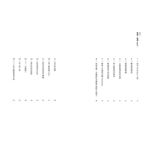 後來我們把整本書的方向做了調整,放棄掉大量已經完成的內容,只留下幾個讓新手球迷能夠稍微入門棒球的章節。其餘的部分,我就來寫寫我這可以說是異常複雜的YouTuber生涯。雖然我成為YouTuber只有短短幾年的時間,我也不是什麼百萬訂閱等級的流量怪物,但是我這幾年經歷過的事情可能比很多人都還要更豐富。從科技業轉職棒球YouTuber、到美國職棒大聯盟採訪世界級的頂級球星、從版權問題中重新找出生路、引發炎上風波的新竹棒球場工商、一口氣走遍美國職棒大聯盟的三十座球場,然後當然還有我那出現在各大新聞版面的家暴離婚事件。這些故事不論是好的還是壞的,都是我生命中的一部分了,如果透過寫書的方式把它們記錄下來,對我自己很有意義,並且應該也會有蠻多人想要了解這些事件的細節吧。所以,何不呢?就把這些內容加進我的書裡吧。