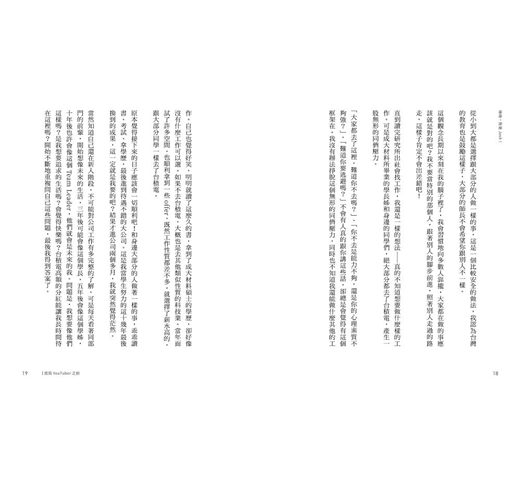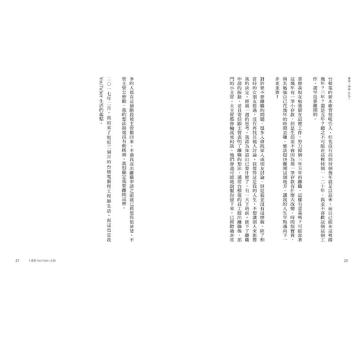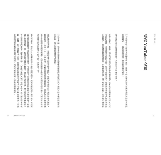 這就是本書會以這個結構呈現的原因了,希望你能夠在這本書裡找到你有興趣的內容。看完之後,不妨也可以往前、往後翻一下,這些看似發散的各種主題,是我這幾年來的心路歷程。就像我前面提到的,它們的存在構成了現在的我,不論是好的部分還是壞的部分,我都想跟所有人分享。