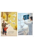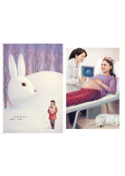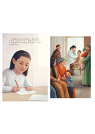 小白喜歡白色,她對白色情有獨鍾,這也象徵她對媽媽的愛和心心相連,小白的白窗簾、白毛衣,呼應媽媽的白袍;她喜歡白兔、白熊和白狗,小白抱著心愛的白熊娃娃,而白狗靜靜陪伴在認真工作的媽媽身邊……。本書透過左右跨頁的圖畫,分別描繪小白與媽媽在兩地的生活,母女間的甜蜜牽絆,更被深刻呈現:右頁圖畫以白色邊框包圍,那可能是媽媽實際在工作的情景,也可能是小白想像中的畫面。她和媽媽相隔兩地,卻不焦慮,她專心寫著給媽媽的信,相信媽媽正用心的工作,替病人看病;她喜歡看白白的月亮,因為她知道媽媽也喜歡、她和媽媽看到的是同一個又大又圓的月亮;她對鴿子說話,那些要給媽媽的話,彷彿鴿子都能替她傳達;當家裡貼起春聯,她就知道媽媽要回來和她一起吃餃子了。