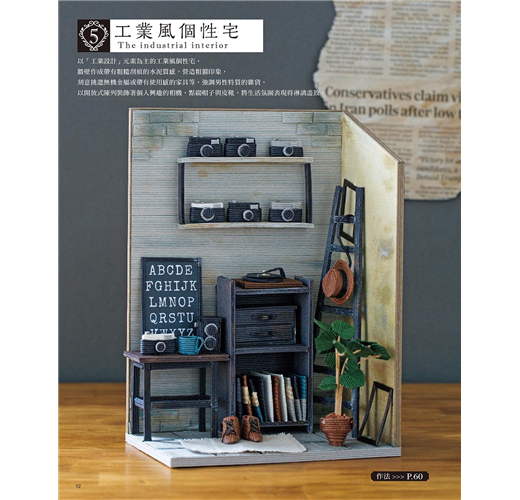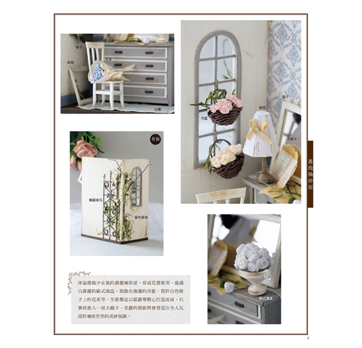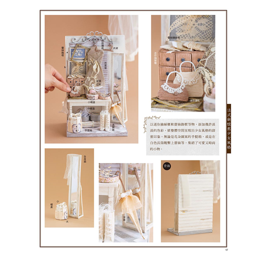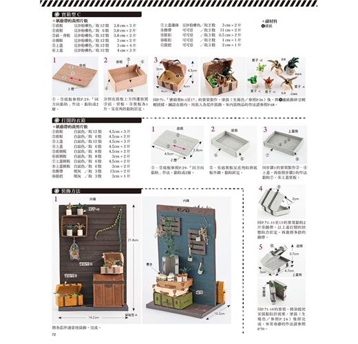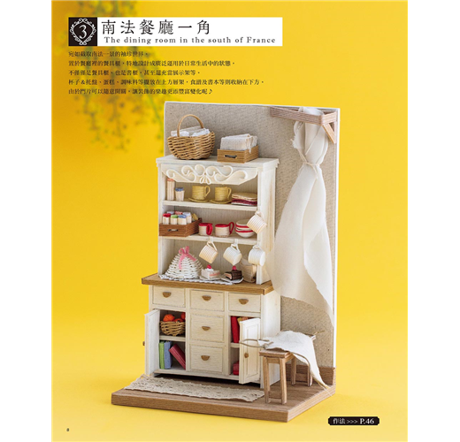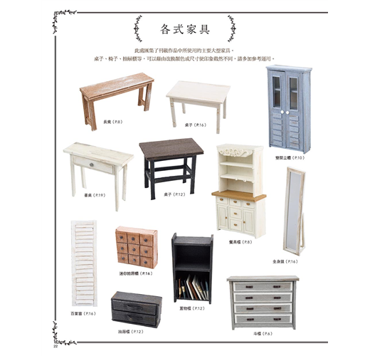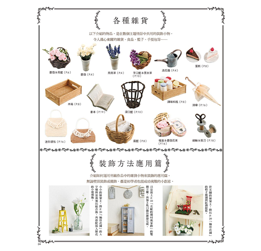 本書收錄的作品皆為袖珍模型尺寸。小小的家具及雜貨,全部都是能平放在手掌上或指尖上的大小。不論是作為居家擺飾,或是當作娃娃屋的背景來搭配組合都令人感到樂趣無窮。作為基底的房屋縮小比例雖各有不同,但會視整體的平衡感來決定家具或小物的比例,不過整體而言會作得稍微大一些。每個造景中的所有作品,無論是大型家具還是裝飾小物,全都附有詳細的彩色圖解步驟教學,即使是從未接觸過袖珍模型的新手,也能一步一步看圖製作!