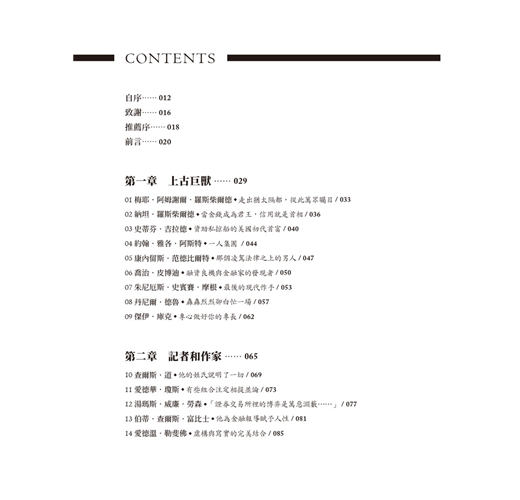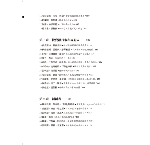 書裡這些迷人的傢伙,許多位其實可以歸入多個不同章節。好比J.P.摩根,怎麼可能只將他放進一個框架呢?還有班傑明.葛拉漢,他本是作家,但也遠遠不僅於此,正如同許多偉大先驅們一樣。然而我還是必須將他們分門別類,將他們劃入我覺得最合理的章節。如果你對此有不同看法,還望你多包涵。另外也請留意,他們之中有許多人的人生是相互關聯的,因此當某篇故事的主人翁在另一篇故事中被提及時,其名會以粗體標示,以便你能快速翻找到該篇故事,瞭解更多內容。