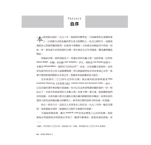 再者,這讓我在必要時我可以坦然批評筆下人物,因為死者不會興訟。在這些故事裡你可以看到,有些人我加以讚揚,有些則加以指責。在他們都已故去的情況下,不會有人指責我毀了某人不復存在的事業。然後就是我的父親,菲利普.費雪。某方面來說,是他讓我意識到把本書局限於逝者的美妙之處。當我第一次考慮著手寫這本書時,我想過要納入十幾位仍在世的傳奇,但如此一來,就不可能把我的父親排除在外,因為他對成長股投資學派的形成與開拓,有著巨大的貢獻。