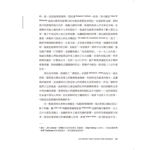 本書中大多數名字都鮮為人知,也許你在圖書館裡可輕鬆找到其資訊的只占四分之一,其餘只有少少摘選資料,需要你更深入挖掘;但在許多情況下,那已是對他們人生最完整、最濃縮的描述了。如果你想瞭解更多某人物的生平,翻翻他們的參考書目吧。但你在其他任何傳記中,不會看到他們的人生對市場有何影響的有意義分析。而這,就是我認為我在本書中的另一貢獻。正如我第二本書《華爾街的華爾滋》以簡短故事呈現,我為《富比士》寫的專欄僅一頁篇幅,我習慣把一整個長篇史詩濃縮成幾個段落。對此我已很有經驗,我也希望這些經驗能讓我更好地處理這百位極有趣人物的故事。在每篇故事裡,我都試著透視他們的貢獻,提供其人生概貌,並告訴你一兩個重要的經驗教訓。