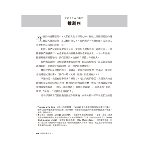 幸運的是,我們有好多好多「導師」,可以向他們學習。我們偉大的老師們往往是極具魅力的人物,他們的生活和冒險經歷,豐富了我們對投資旅途的喜愛與著迷。一如莎士比亞寫道:「此戲正是關鍵。」或者正如「亞當.斯密」所說:「這就是金錢遊戲!」