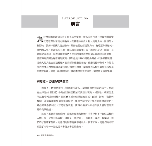 然而,推動市場形成的,是改革背後的個體。本書介紹了一百位這樣的人物,每一位都有所貢獻,可能是一個教訓、一項創新,或者一場騙局。他們的才智帶來創新,而他們的影響造就市場本身。簡單來說,是他們的才智塑造了市場──這就是本書英文書名的由來。