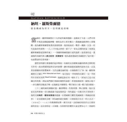 2. 收錄羅斯柴爾德家族、J.P.摩根、查爾斯.道、巴魯克、李佛摩等市場大亨與金融界名人的故事,一窺巨頭們波瀾壯闊的精彩人生。