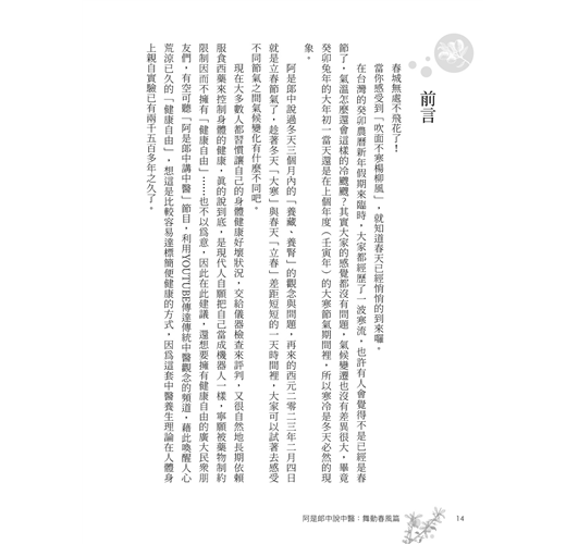 「阿是郎中」,倡導順應自然,強調人人可以「健康自由」。所以首先用春天的六個節氣中的「舞動春風篇」,來提醒愛好自然的朋友們,期許可以在自然的觀念下,沐浴自己一生健康的春風。