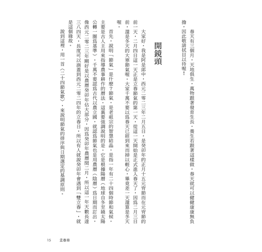 有時候,生活是需要像籠罩我們周遭的節氣一樣,平心靜氣面對。一年四季的節氣變化,也需要用啟、承、轉、合的方式來配合,不需要對抗,只是順應自然,身體健康就可以順利開花結果。