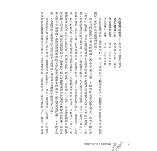 ◎淺顯易懂的專業說明,加上鄭醫師創作的詩詞歌賦,了解中醫養生的同時,也感受蓬勃的生命力量。