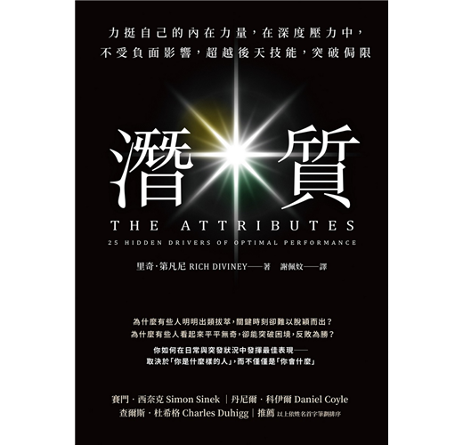 VIDEO 為什麼有些人明明出類拔萃,關鍵時刻卻難以脫穎而出? 為什麼有些人看起來平平無奇,卻能突破困境,反敗為勝? 你如何在日常與突發狀況中發揮最佳表現── 取決於「你是什麼樣的人」,而不僅僅是「你會什麼」 退役海豹部隊指揮官里奇‧第凡尼根據二十年的選拔人才經驗發現,當充滿不確定性、迫使你憑直覺行事的情境下,能發揮最佳表現的人,並非全是學經歷漂亮,看似完美的天才,而是懂得發揮自身核心潛質的人。 ▍潛質超越技能,驅動最佳表現 潛質是深植於每個人內在的中性特質,決定一個人如何吸收、處理和回應周遭環境。技能或許會引導我們一般情境下該怎麼做,但潛質決定了我們如何面對混亂與危難,並在高壓下繼續前進。天生的潛質沒有好壞,一個人的潛質為他帶來優勢或劣勢,端看情況而定,只要將適合的潛質放對的位置,就能有不同的效果。 ▍調節你所需潛質,激發高效能 每個人都有屬於自己的潛質分布,我們不需要將所有潛質強化,重點是知道自己哪些潛質強、哪些潛質弱。壓力愈大,浮現的潛質就會愈加清楚可辨,本書作者將潛質分為5大類:恆毅力、心智敏銳度、動力、領導力、團隊力,共計25個核心潛質。根據這25種潛質,引導你如何自我觀察自身潛質曲線,並懂得適應情境調節。 你很會洞察環境,卻常常喘不過氣?那你的狀態意識可能很強,卻不擅長區隔化。 你可以快速轉換注意力,卻重複犯同樣的錯?那你可能很會切換任務但學習力較低。 當我們愈能了解自己行為背後的動力與潛質組合方式,就能有更好的表現。甚至可以反過來觀察他人潛質,找出適合協作的對象。 ▍用對力氣,才能做對事情 本書提供價值清單,讓你覺察既有潛質,並運用強化潛質5步驟,引導你充分發揮並適當強化,甚至挖掘出你從不知道自己有的沉睡能力。在這個不斷調整與校正的過程中,無論我們未來陷入何種境地,都能依靠潛質相信自己,突破困境。 潛質的力量無所不在, 你特有的潛質組合能幫助你在任何地方和任何時刻表現得更好!