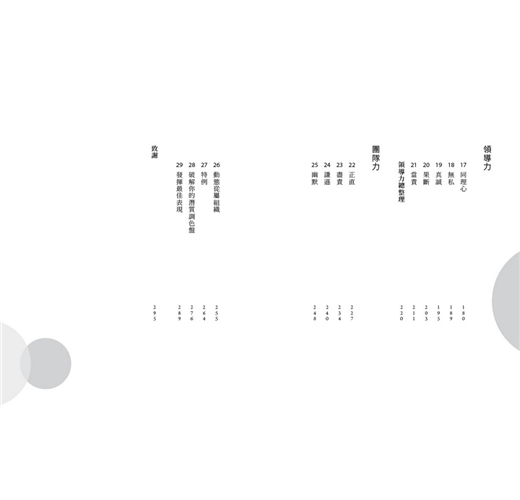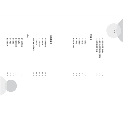 目錄 1. 隱而不見的驅動力 2. 如何在跳傘出狀況時存活下來 3. 夢幻團隊的弔詭 恆毅力 4. 勇氣 5. 毅力 6. 適應力 7. 復原力 恆毅力總整理 心智敏銳度 8. 狀態意識 9. 區隔化 10. 任務切換 11. 學習力 心智敏銳度總整理 動力 12. 自我效能 13. 紀律 14. 開放心態 15. 狡猾 16. 自戀 動力總整理 領導力 17. 同理心 18. 無私 19. 真誠 20. 果斷 21. 承擔 領導力總整理 團隊力 22. 正直 23. 盡責 24. 謙遜 25. 幽默 26. 動態層級組織 27. 其他潛質 28. 破解你的潛質調色盤 29. 發揮最佳表現 致謝