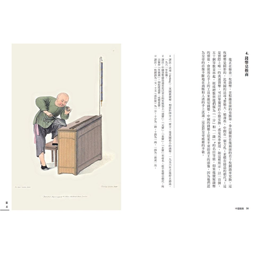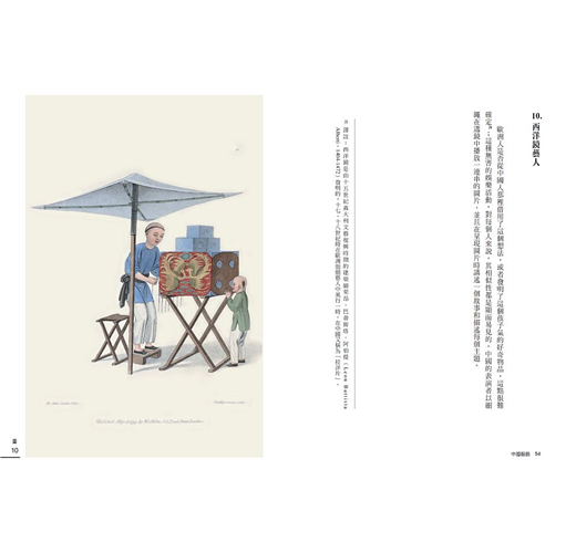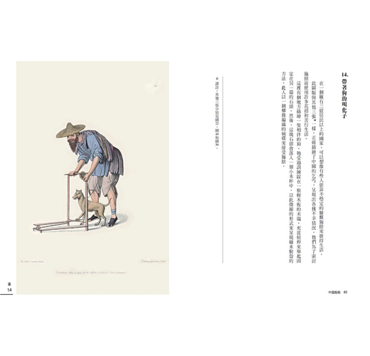 本書是畫師蒲呱接受當時在廣州養病的英國軍官喬治.梅森委託所繪,他抱著寰宇蒐奇的心態,凡與當時西洋社會不同的中國風俗都在蒐羅之列,尤其更加關注市井小民的生活百態。全書六十幅插圖,銅版精印,手工上色,配上文字說明,內容包含:達官貴婦、販夫走卒、工匠藝人、士兵平民、乞丐僧人等,於一八○○年在倫敦出版,當時引發頗大反響。