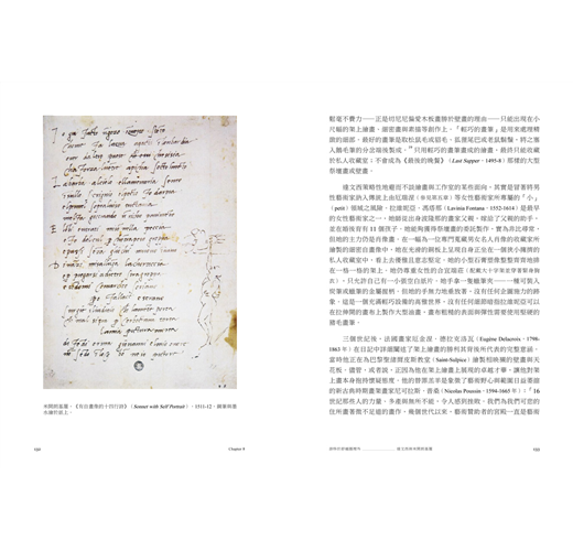 達文西策略性地避而不談繪畫與工作室的某些面向,其實是冒著將男性藝術家納入傳統上由厄瑞涅(參見第五章)等女性藝術家所專屬的「小」(petit)領域之風險。拉維妮亞‧馮塔那(Lavinia Fontana,1552-1614)是最早的女性藝術家之一,她師從出身波隆那的畫家父親,嫁給了父親的助手,並在婚後育有11個孩子。她能夠獲得祭壇畫的委託製作,實為非比尋常,但她的主力仍是肖像畫。在一幅為一位專門蒐藏男女名人肖像的收藏家所繪製的細密自畫像中,她在光滑的銅板上呈現自身正坐在一個狹小擁擠的私人收藏室中,看上去優雅且意志堅定。她的小型石膏塑像整整齊齊地排在一格一格的架上。她仍尊重女性的合宜端莊(配戴大十字架並穿著緊身胸衣),只允許自己有一小張空白紙片。她手拿一隻蠟筆夾——一種可裝入炭筆或蠟筆的金屬握柄。但她的手無力地垂放著,沒有任何企圖施力的跡象。這是一個充滿輕巧設備的高雅世界,沒有任何細節暗指拉維妮亞可以在拉伸開的畫布上製作大型油畫,畫布粗糙的表面與彈性需要使用堅硬的豬毛畫筆。
