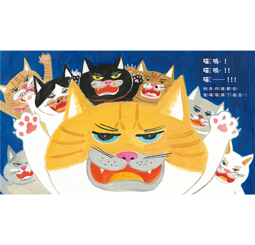 他到處咬咬,咬房子、咬車子、咬富士山,每樣東西的頂部,都被他咬出一個貓咪的形狀了!咬完這些還不夠,他又跑去咬水果和動物,大家快被他氣死了。