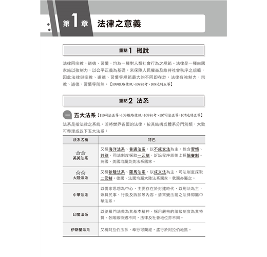 將重要的法律,如憲法、行政法、民法、刑法及訴訟法等,做重點系統複習,從基本知識、法律制定、效力、解釋與適用、制裁,乃至於司法救濟與各別重要法律內容,一舉囊括,內容以粗體標示關鍵字、架構易讀好記,搭配「素養學堂」內容提點,讓你事半功倍!