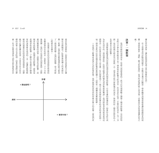 透過行為科學、心理學,以及現實生活的諸多案例,謝赫拉爾為我們指引出能有效達成目標的決策框架該如何建立。他認為,我們所做的每個決定,從最小的到最重要的,都可以依照頻率與影響所交織而成的決策框架上分類,藉此了解自己在執行的決策類型是什麼,進一步決定該為這項決定付出多少心力,例如從對自身影響較低的決策(去面試時該穿什麼顏色的西裝)中抽離,投入到對自己更高影響的決策(找專業人士幫我提昇面試技巧)之上;又或者是將高頻率的決策(午餐吃什麼)轉變為低頻率的決策,也就是一旦做出選擇就不需要再花費心力去思考和處理(例如在星期日晚上做好一整周的便當),幫助我們釋放重要的思考能量到更重要的事情上。