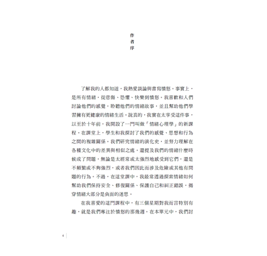 了解我的人都知道,我熱愛談論與書寫憤怒。事實上,是所有情緒,從悲傷、恐懼、快樂到憤怒。我喜歡和人們討論他們的感覺,聆聽他們的情緒故事,並且幫助他們學習擁有更健康的情緒生活。說真的,我實在太享受這件事,以至於十年前,我開設了一門叫做「情緒心理學」的新課程。在課堂上,學生和我探討了我們的感覺、思想和行為之間的複雜關係。我們研究情緒的演化史,並努力理解在各種文化中的差異與相似之處。還提及我們的情緒什麼時候成了問題,無論是太經常或太強烈地感受到它們,還是不頻繁或不夠強烈,或者我們因此而涉及危險或其他有問題的行為。不過,在這堂課中,我最常透過探索情緒如何幫助我們保持安全、修復關係、保護自己和糾正錯誤,揭穿情緒大部分是負面的迷思。
