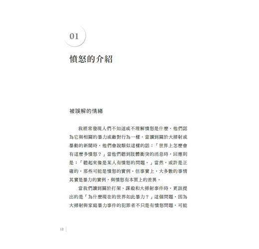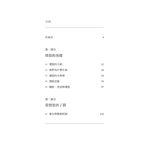 為了傳遞這一切,我把本書分成三個主要的部分。第一部分〈憤怒的基礎〉,介紹憤怒這種情緒。當中的五個章節概述了憤怒是什麼、為什麼人會生氣、導致憤怒的思維類型、憤怒的生物學,還有我們如何根據種族或性別來辨識憤怒。第二部分〈當憤怒出了錯〉列出憤怒管理不佳時,會產生哪些主要的後果。這部分的四個章節中,我描述了憤怒與暴力之間有點複雜的關係、憤怒如何破壞關係、憤怒對身心靈健康造成的後果,以及憤怒如何引導我們做出非理性的決定。最後,在本書的第三部分〈健康的憤怒〉中,描述我們該如何理解、管理憤怒,並用於正向積極的方面。當中的每一章都包含案例研究、相關研究及活動,來幫助你以正向的方式與自己的憤怒連結。