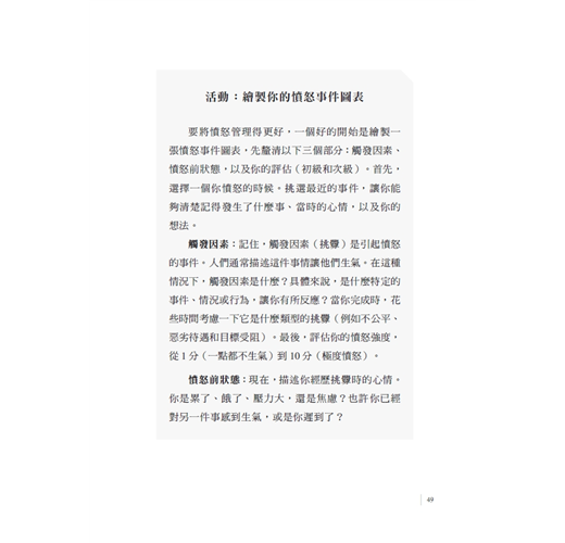 每章結尾的活動,包括我和學生及客戶們做過的練習,用來幫助他們探索自己為何憤怒、憤怒是什麼感覺、它告訴我們什麼,以及如何用最佳方式管理它。這些活動包括簡短的書寫練習、調查及重新思考憤怒的方法。這些工具不只在你閱本書時有幫助,隨著時間推移,當你努力體驗健康的憤怒時也能提供幫助。