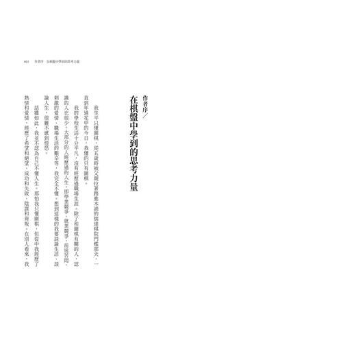在其中一個篇章<超越勝敗的情緒>中,寫中了身為圍棋人面臨到輸贏時的情緒轉折及他是如何消化情緒,這些經過千錘百鍊所累積下的智慧,不論是在過往還是AI時代都很受用!非常推薦大家拜讀這本書,不論是否會下圍棋,相信都可以在書中找到啟發與共鳴的地方。」──黑嘉嘉