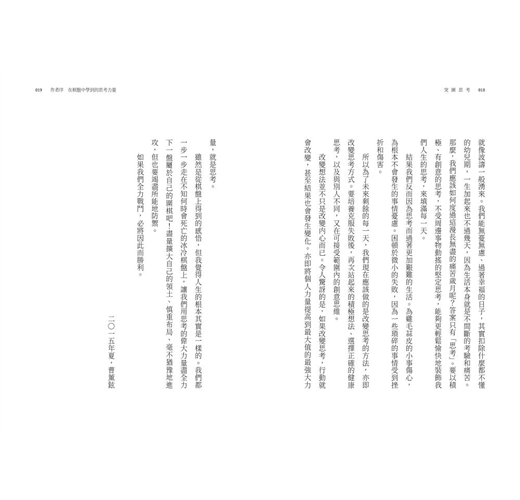 「作者曹薰鉉在書中敘述著自己成為圍棋棋手、邁向最高旗手的經歷,從圍棋中體悟到的思考之道,又是如何透過思考來拯救失敗與痛苦中的自己、突破困局。這些難得的經驗,都有助於擴展思考的深度與廣度,探索不一樣的可能性。」──劉奕酉