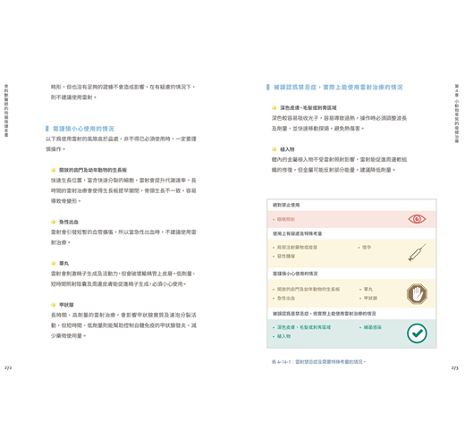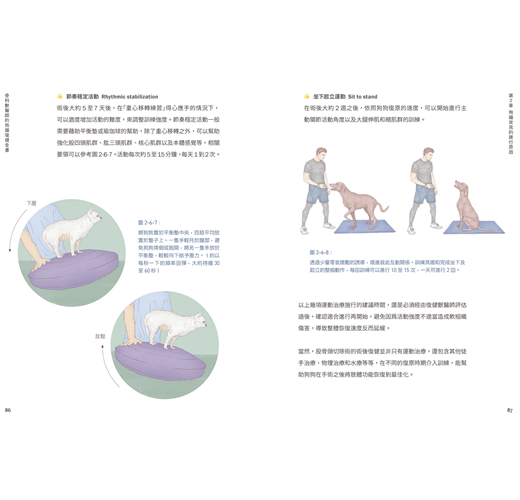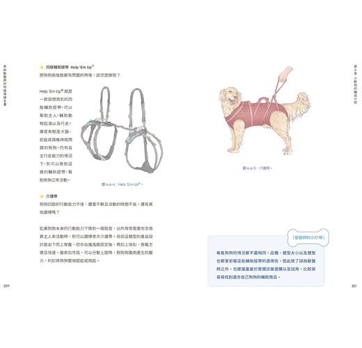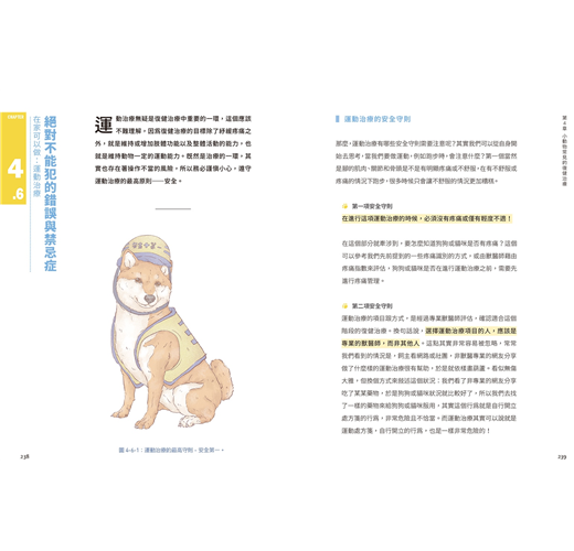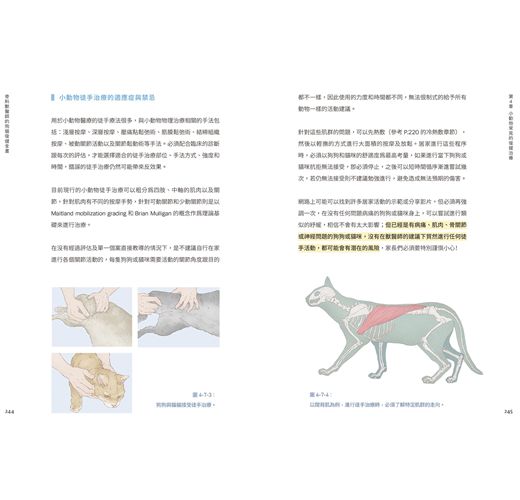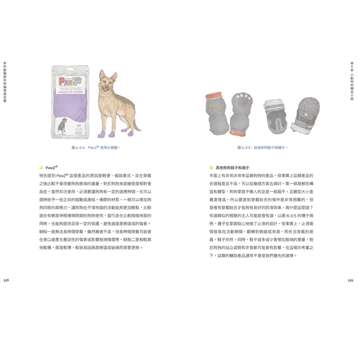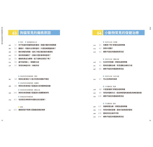 在了解了各種疾病和治療方法之後,作者接著介紹了小動物常見的復健治療方法,包括冷熱敷、電療、雷射、震波、運動治療和水療等多種方式,不光只是泛泛介紹,而是針對這些工具的優缺點、使用時機,甚至操作方法,都深入剖析。作者也貼心地介紹了居家照護和輔具的使用方法,幫助飼主們為寶貝們提供更好的生活環境,並協助牠們在外科治療之後,盡快恢復運動能力。