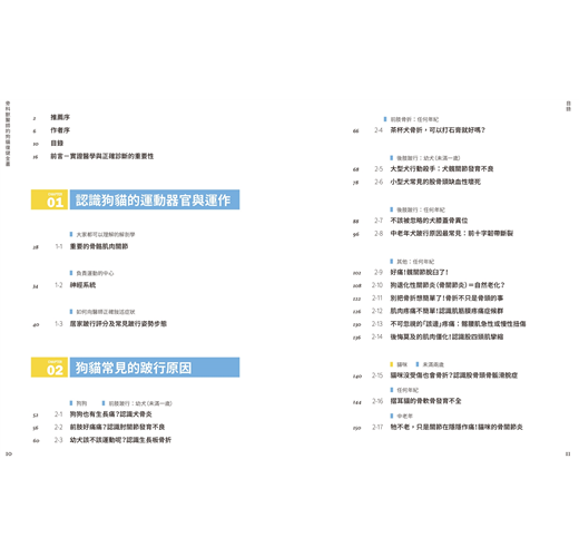 《骨科獸醫師的狗貓復健全書》不僅適合一般飼主閱讀,作為居家照護的參考,因為內容已經囊括了幾乎所有常見的小動物骨骼、肌肉和神經疾病,其實它也非常適合家庭獸醫師作為日常診療的工具書,讓獸醫師們可以有效率地做出有邏輯、不浪費飼主醫療費的正確初步診斷。