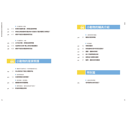 手術、治療、照護、營養品、輔具知識在地化,從幼年、靑壯年到老年照護,與各種體型的狗狗與貓咪都適用。