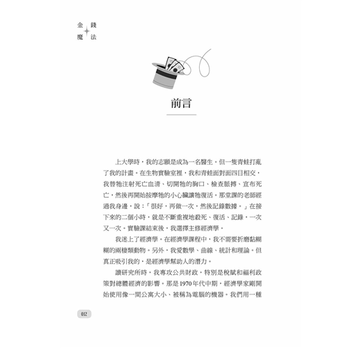 上大學時,我的志願是成為一名醫生。但一隻青蛙打亂了我的計畫。在生物實驗室裡,我和青蛙面對面四目相交,我替牠注射死亡血清、切開牠的胸口、檢查脈搏、宣布死亡,然後再開始按摩牠的小心臟讓牠復活。那堂課的老師經過我身邊,說:「很好,再做一次,然後記錄數據。」在接下來的兩個小時內,就是不斷重複地殺死、復活、記錄,一次又一次。實驗課結束後,我選擇主修經濟學。
