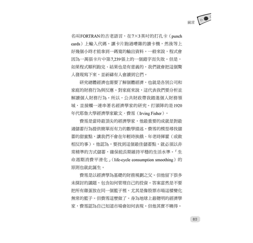 2. 書中每項金錢魔法妙招都是奠基於經濟學常識,作者用幽默淺白的話闡述人生面臨教育、職業、婚姻、生活方式、住房、保險、投資、退休年齡等相關財務決策,並進一步討論各種方案的優缺點、需留意的細節與陷阱等豐富的財務規劃觀點,兼具易讀性與實用性。