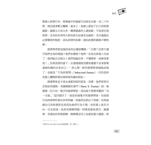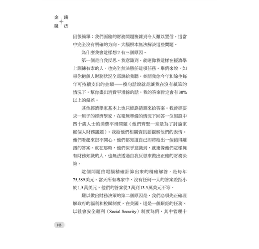 經濟學家並不是永遠都持相同意見。其實,他們常常否定彼此的論點。美國總統杜魯門(Harry S. Truman)說,他需要一位只有一隻手的經濟學家,因為他不想要再聽到「另一方面」這四個字了。我是有兩隻手的經濟學家,但我對行為財務學的看法非常明確。我強烈反對以下前提:民眾搞砸自己的財務狀況是因為他們行為不端、在財務上迷失方向、目光短淺,或是有精神問題。即便是最負責任、最謹慎、受過良好財務訓練、精神穩定的人也會犯重大錯誤。原因很簡單:我們面臨的財務問題複雜到令人難以置信,當中完全沒有明確的方向,大腦根本無法解決這些問題。