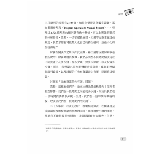 難以做出財務決策的第二個原因是,我們必須先正確理解政府的福利和稅賦制度。在美國,這是一個艱鉅的任務。以社會安全福利(Social Security)制度為例,其中管理十三項福利的規則有2728條。如果你覺得這個數字還好,那在其操作規程(Program Operations Manual System)當中,管理這2728條規則的細則還有幾十萬條。再加上複雜的聯邦與州所得稅,沒錯,一切都超級瘋狂。如果不完整掌握這些規定,我們怎麼有可能最大化自己的終生福利,並最小化終生稅務呢?