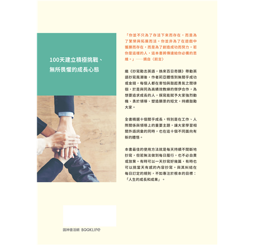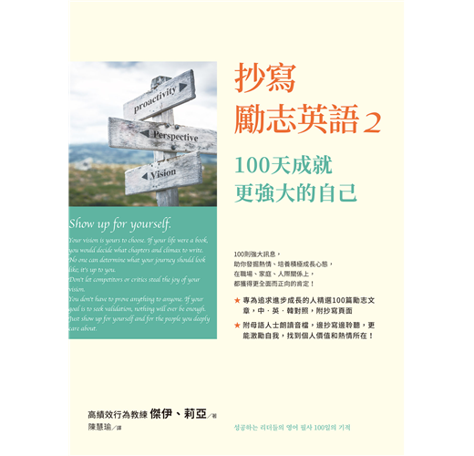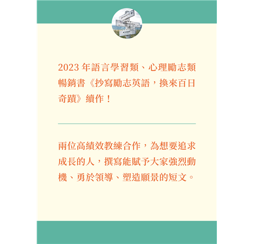 繼《抄寫勵志英語,換來百日奇蹟》帶動英語抄寫風潮後,作者莉亞體悟到無關乎成功或金錢,每個人都在害怕與鼓起勇氣之間徘徊,於是與同為高績效教練的傑伊合作,為想要追求成長的人,撰寫能賦予大家強烈動機、勇於領導、塑造願景的短文,持續鼓勵大家。