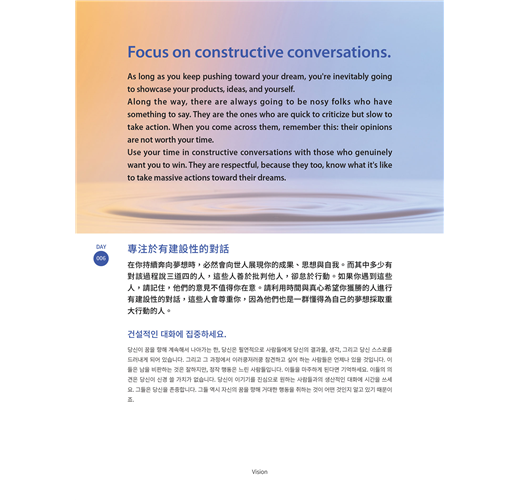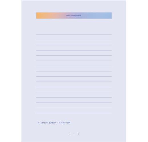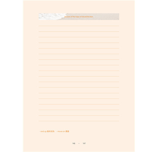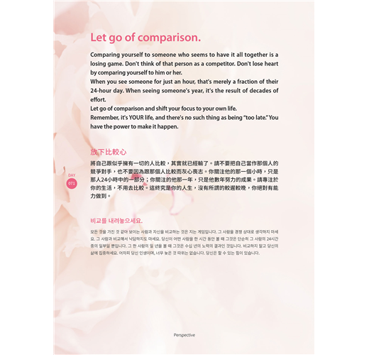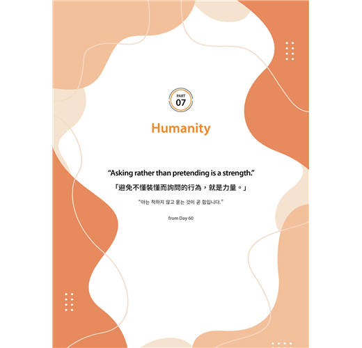 本書最佳的使用方法就是每天持續不間斷地抄寫,但若無法做到每日履行,也不必自責或放棄。有時可以一天抄寫好幾篇,有時也可以挑當天有感的內容抄寫。與其糾結在每日訂定的規則,不如專注於根本的目標:「人生的成長和成果」。