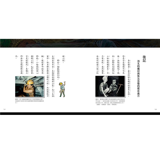 童書文字精簡,卻將煤鄉的日常刻劃得栩栩如生,煤鄉孩子童年的片鱗半爪彷彿就在讀者眼前。這段煤鄉歷史雖已遠颺,但總有某些值得我們緬懷與感恩的人事物……