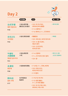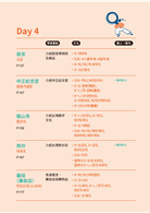 全書安排5天4夜的行程,從體驗台灣人日常的小場景,如便利商店、捷運、家樂福、飲料店、藥妝店等,到韓國人必訪的大景點,如野十金九、故宮、中正紀念堂、龍山寺等都囊括在內。