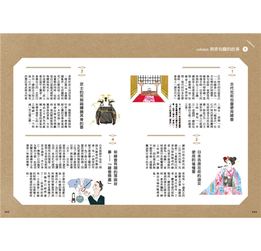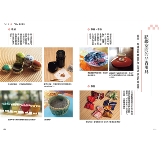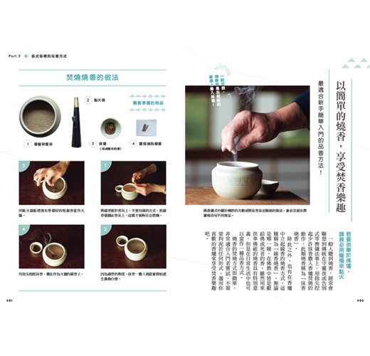 書中不僅關注薰香的功能性,並介紹香具在空間裝飾中的應用。香具的時代演變下,也發展出包羅萬象的造型,有古典香爐也有時尚香座、香盤造型等,大家可依據自己喜好選擇,營造出美觀而舒適的生活環境,使薰香不僅成為一種療癒工具,更成為提升居家氛圍的擺飾。
