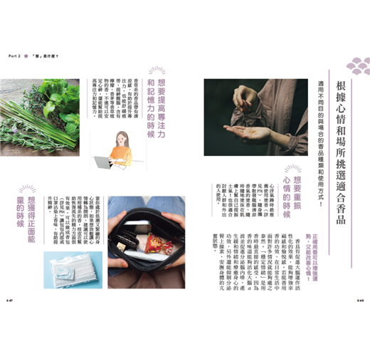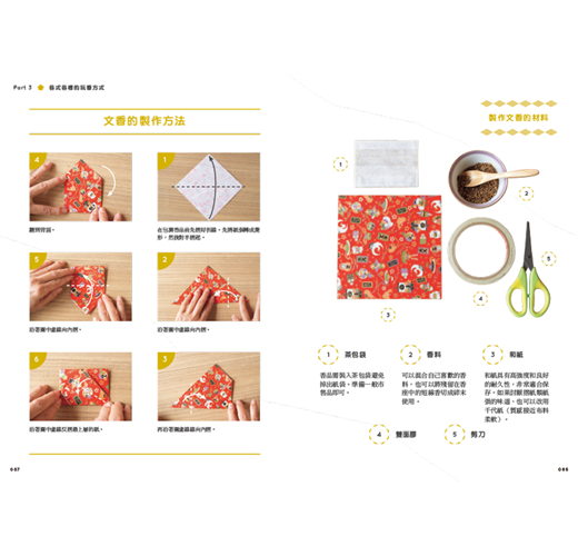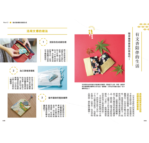 書中收錄隨身攜帶「常溫飄香」的香包、文香製作方法,可以隨著當下心情、季節更換,放在錢包或包包裡,除了散發芬芳外,據說也有提升財運、工作運之功效;放在車上可以當成芳香劑使用;若是添加防蟲菊,放在衣櫥作為防蟲香使用,可依自己的需求廣泛運用。