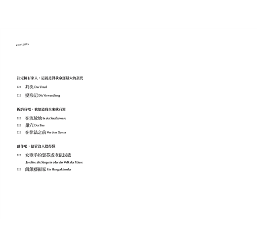 本書精選17篇卡夫卡最具代表性的中短篇作品,並分為五大主題: