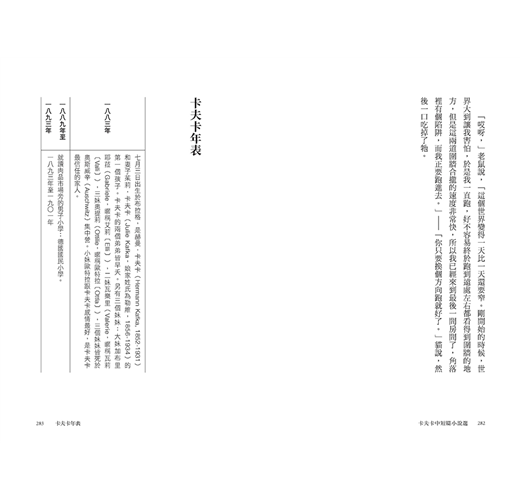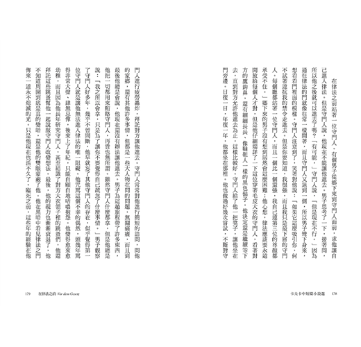 名人推薦:●「沒有其他作家比得上卡夫卡,和他相比,喬伊斯顯得愚昧,紀德太過甜膩,湯瑪斯曼空洞浮誇,只有普魯斯特能勉強與之比肩。」──蘇珊.桑塔格(Susan Sontag)