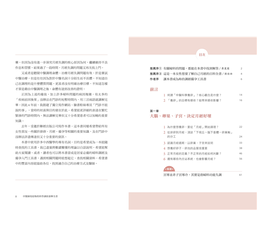 本書中使用許多中西醫學的專有名詞,目的是希望成為一本能隨時查找的工具書,我已盡量將艱澀難懂的理論以白話說明,希望能幫助大家閱讀。或者,讀者也可以將本書當成是居家必備的婦科調經及備孕入門工具書,遇到相關問題時能想起它、查找相關資料。希望書中的豐富內容能協助各位,找到適合自己的治療方式及醫師。