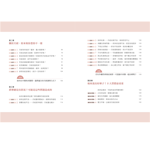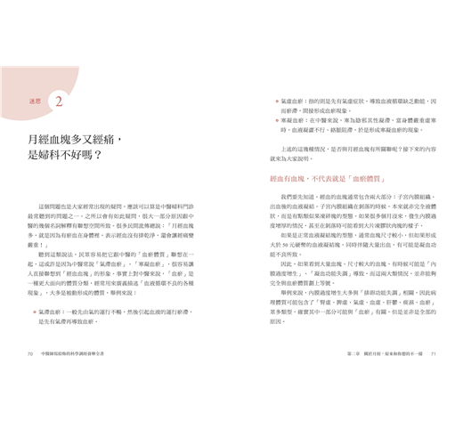 書中不僅詳細介紹中西藥物的治療方式,也提醒大家易忽略的生活作息及飲食起居,讓讀者知道為什麼單純只靠藥物治療往往無法根治婦科問題,其實也需要在生活作息上盡量配合,也體現中醫治療的整體觀。