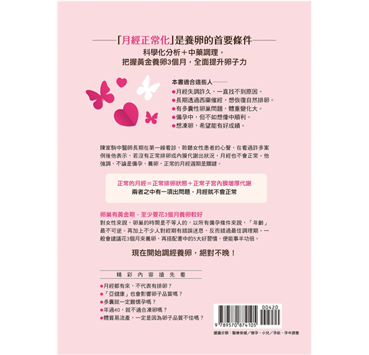 同樣作為臨床多年的中醫師,我個人相當推薦這本《中醫師寫給妳的科學調經養卵全書》,相信看過的讀者無論男女,都能對於「調經養卵」有更清楚的收穫。