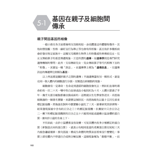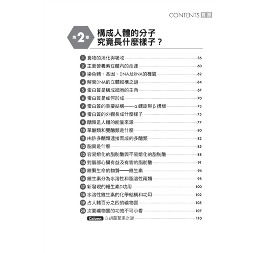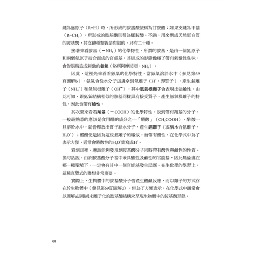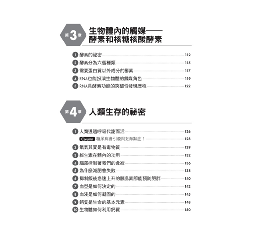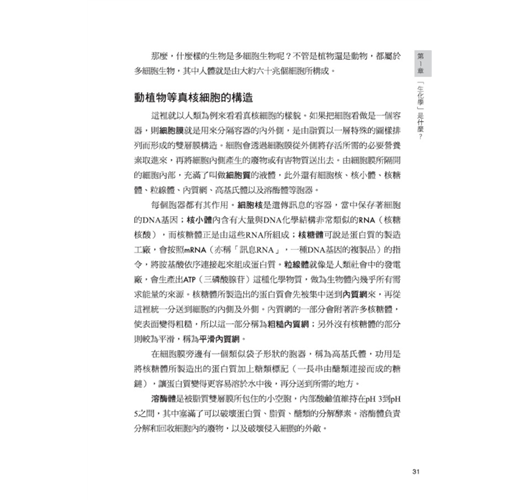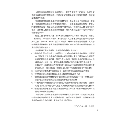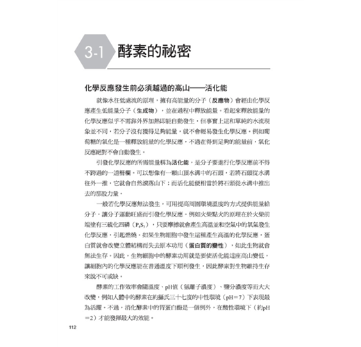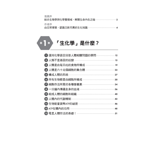 細胞和組織是人體的組成元件,用以形成心、肝、腎、肺、胃腸、骨骼、皮膚等器官,再進而構成身體的呼吸、循環、消化、泌尿、排泄、神經、外皮、內分泌及免疫等系統;而生化學的研究領域,便是從化學當中物質分子的組成、結構、以及彼此間的化學變化等層級和角度,來探討發生在生物上的各種生命現象。隨便舉些本書提及的有趣問題,例如,「我們每天吃進去的食物在體內究竟有什麼作用?」、「為何甜甜的糖果會在體內轉成脂肪使我們發胖?」、「人活著必須呼吸,而何以氧氣是絕對不可或缺的?」等等,這些生活中看似理所當然卻不明所以的疑問,其實都是和「生化學」密切相關的課題。
