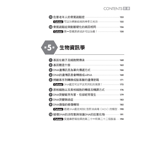 內容除了重新詮釋舊有知識以外,更收入新穎知識的概念,尤其以下篇章特別引人入勝,值得細心閱讀。既有知識方面,譬如:胡蘿蔔素「治」癌與「致」癌之謎、突變是癌細胞的成因、日光浴可治療肺結核……等。而關於新穎知識註解方面,則譬如:輸血會引發心臟麻痺、氧氣是有毒物質、骨質疏鬆的病因與動脈硬化相同、再怎麼操作基因也無法同時達到防癌與長壽的效果、糖尿病會引發阿茲海默症……等。作者別開生面、「剝絲又抽繭」地娓娓道來,或以「舊瓶裝新酒」地款款述說,雖然牽涉的道理艱深,但都能讓初學者心領神會,實在難得。