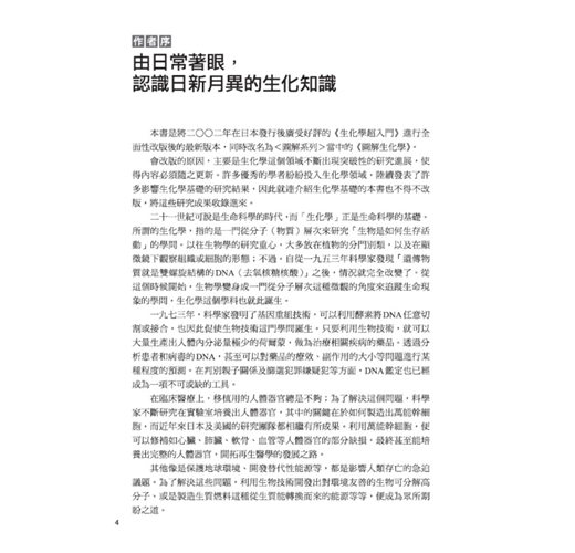 綜觀內容,《圖解生化學》一書,真可提供給需要生物化學專門知識之大學生,和意欲加強生化相關常識的一般人士之用。書中有約一百幅圖解,協助讀者瞭解生物化學上一些基本認識與原理觀念,進而洞悉生命的奧祕。以本人主修生化獲博士學位的訓練背景,與在臺大教授「生物化學」課程超過三十年的教學經驗,研讀本書還能得到「生化」新知識,也認為本書內容對修讀生物化學的學生大有助益,因而對《圖解生化學》一書,特別強力推薦。