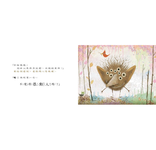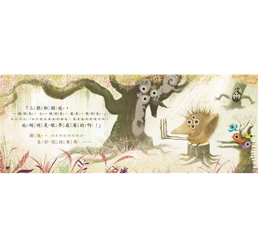 值得注意的是,擁有多隻眼睛的樹枝怪,好像在提醒讀者好好「打開」眼睛,別蒙著頭錯過了身邊的美好。同理,閱讀本書也是驚奇的體驗,只要打開雙眼仔細觀察,書裡的世界也能讓你大開眼界!透過樹枝怪的眼光,我們得以注意並開始欣賞四處都能驚訝的細節:像煙火般綻放的花朵、像耳語般的風、向我們揮手的海浪……就連面對突如其來的神祕客人,樹枝怪也能打開心胸認識這位新朋友,真誠的帶新朋友認識自己眼中的世界。眼睛讓我們發現所見,但差別在於有的人看什麼都一樣,有的人卻每一眼都是新的!關鍵就在於是否有打開內心。心胸寬闊便能容納萬物,從單純的「觀看」變成細膩的「觀察」,獨特的視覺記憶不僅能烙印在孩子內心,化為成長的歷程與軌跡;開闊的視野更能讓他們學會放下偏見,關懷容易被忽視的人事物,成為一個能夠擁抱並接納他人的獨立個體。