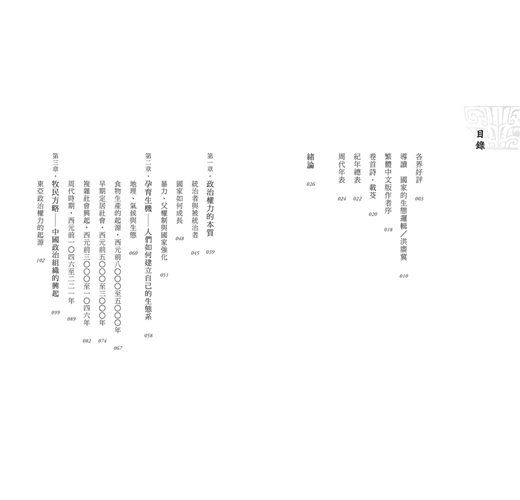 我十分樂見我這本書能以完整的中譯本在臺灣出版,免於中華人民共和國譯者為了使本書內容符合該國官方典範,而不得不進行的微妙改動。本書看待國家試圖維持不偏不倚的立場,因為美國的反政府思想往往服務於有錢人的利益,但我如果能用中文寫作的話,可能會把終章定名為國在山河破」。本書的主要貢獻在於說明國家根本上有意以可供課稅的農業生態系取代自然生態系,而我主張這股動力內在固有於一切政治組織,這就意味著我們的環境危機之根深柢固,超出多數人思考所及,環境問題並不始於工業化,也不會經由簡單的技術進步就得以解決。我希望本書能經由早期中國政治發展的生態學分析,向讀者提供看待今日社會生態與政治的新觀點。