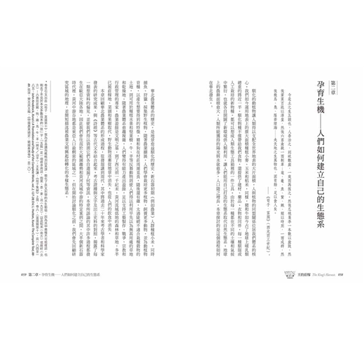 早期中國從仰韶文化開始,到龍山文化、再到商、周時期,作者討論原本豐富多樣的生態系統,如何在人類社會的介入之下,轉變成單一的農耕體系。在這個過程中,王權透過馴化的動植物裡內含的能量,獲得足以支撐政治和國家運作的勞動力和資源。人類是如何建立自己的生態系統?權力團體又是如何透過改造自然環境不斷汲取資源與勞動力,從而興起並逐步壯大?